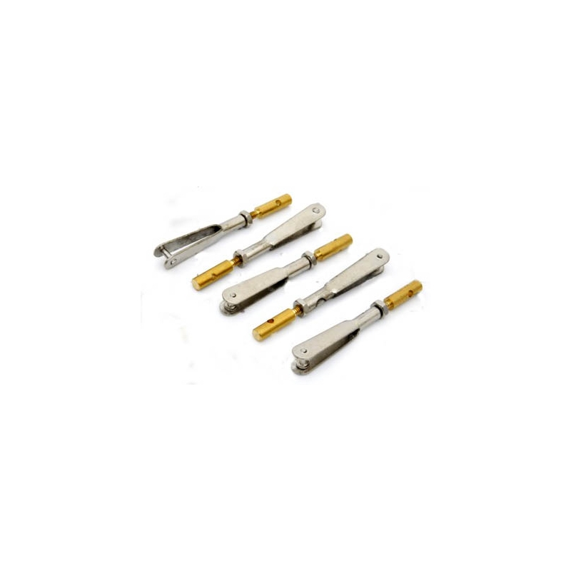 La confezione comprende 5 forcelle d'acciaio lunghe 35 mm con occhiolo inserito, misura M2.