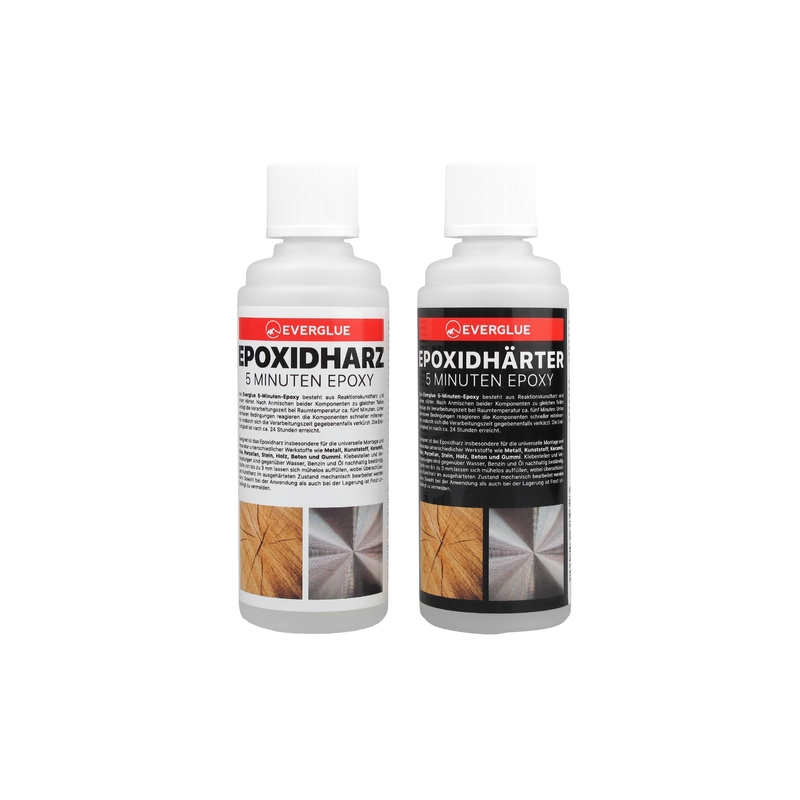 L'epossidico EVERGLUE da 5 minuti è composto da resina reattiva e un indurente. Dopo aver miscelato entrambi i componenti in parti uguali, il tempo di elaborazione a temperatura ambiente è di circa cinque minuti. In condizioni più calde, i componenti reagiscono più rapidamente, il che può ridurre i tempi di elaborazione. La forza finale viene raggiunta dopo circa 24 ore. La resina epossidica è particolarmente adatta per il montaggio e la riparazione universali di materiali diversi come metallo, plastica, ceramica, vetro, porcellana, pietra, legno, cemento e gomma. I punti adesivi e le guarnizioni sono permanentemente resistenti all'acqua, alla benzina e all'olio. Gli spazi fino a 3 mm possono essere riempiti senza sforzo, per cui la resina sintetica in eccesso può essere lavorata meccanicamente allo stato indurito. Il gelo deve essere evitato, sia durante l'uso che durante lo stoccaggio.